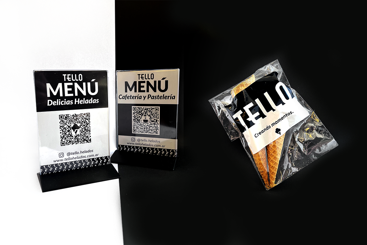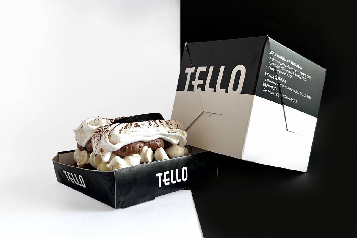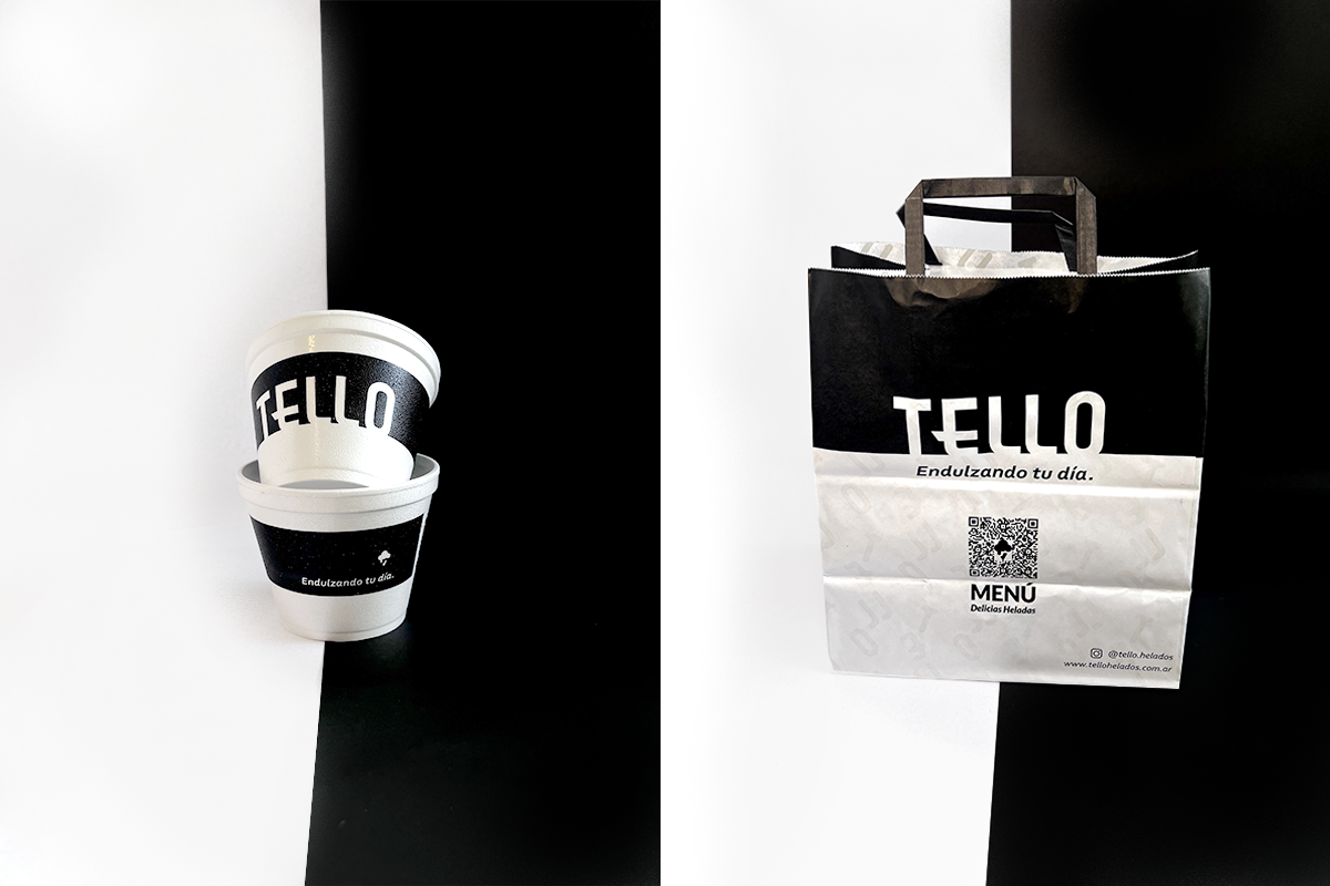 En Standingroup acompañamos esa esencia diseñando una identidad visual sólida: la bajada del logo, packaging de tortas y helados, menús impresos y digitales, así como bolsas y boxes que refuerzan la presencia de Tello en cada detalle de su propuesta gastronómica.